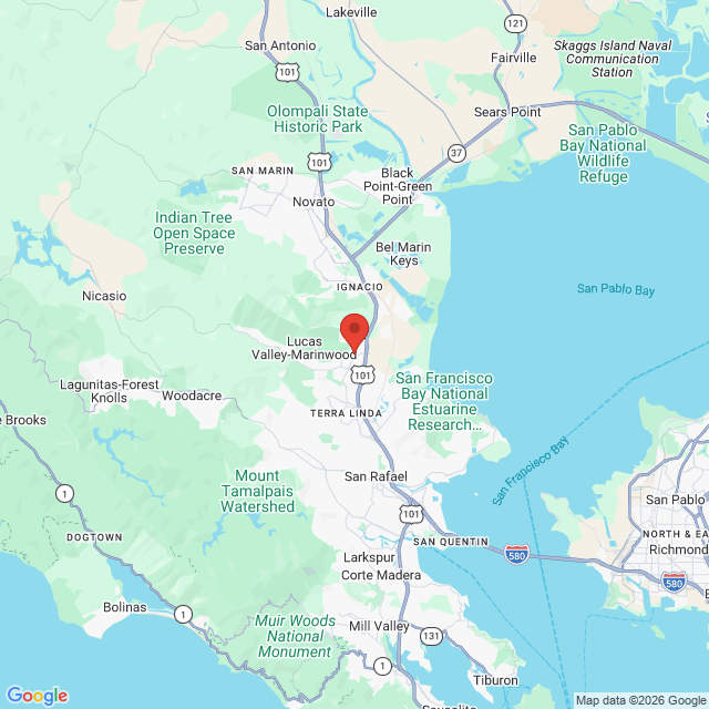 The office complex is on the corner of Miller Creek Rd and Las Gallinas Ave. Google leads you to enter the parking lot on the backside of the complex. Drive around the building and park in front of the office. We're on the ground level on the east side of the building in an outer suite not in the inner courtyard. The glass front door faces the parking lot and is marked #145. You'll also see little colorful prayer flags above the door.